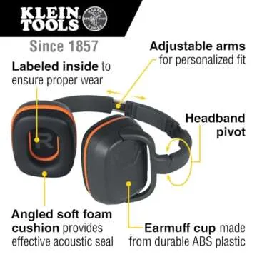 Show moreExperience unmatched comfort and superior sound suppression with the Klein Tools Standard Earmuffs in vibrant orange. Designed for both functionality and style, these earmuffs feature a unique behind-the-head design that allows for ease of use with hard hats and other headgear. With an adjustable fit, these earmuffs provide a snug yet comfortable seal that effectively blocks out harmful noise, making them ideal for both construction sites and more leisurely environments where noise reduction is necessary. The padded ear cushions ensure extended wear without discomfort, allowing you to focus on the task at hand.