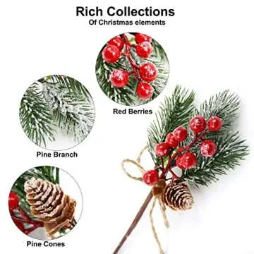 Show more Elevate your holiday decor with our exquisite Christmas Picks Set, a delightful collection of 10 glittering picks and sprays that harmoniously blend evergreen pine branches, vibrant red berry stems, and charming pine cones. Each piece is meticulously adorned with shimmering sequins, making them the perfect accents to enhance your Christmas decorations. With vivid colors and a realistic appearance, they truly encapsulate the warmth and vibrancy of the festive season.