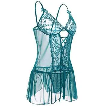 Show moreDiscover the ultimate blend of allure and comfort with the klier Women Lingerie Sexy Chemise Lace Babydoll. This exquisite sheer mesh nightwear captivates with its unique design and stunning dark green hue that gracefully transitions between deep shades of green and blue. Crafted with attention to detail, the babydoll set features stretchy lace cups, satin bow accents, and an adjustable crossed ribbon at the front, embodying a perfect mix of elegance and seduction. The sheer mesh miniskirt is designed for maximum allure with a daring low side slit, accompanied by a matching g-string that completes the look beautifully.