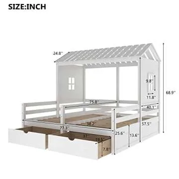KLMM Double Twin Size House Platform Beds with Two Drawers, Wooden Bed Frame with Roof and Window, Bedroom Furniture, Can be Decorated Tent (White-Double Twin)