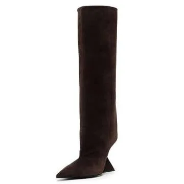 Kluolandi Womens Knee High Boots Sexy Pointed Toe Pull On Strange Wedge Heel Tall Boots for Women Brown Size 5