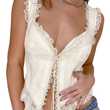 KMBANGI Halter Neck Crop Cami Top Knitted Printed Tank Tops Tee Y2k Sleeveless Strappy Summer Shirts Streetwear (Lace V White,S)