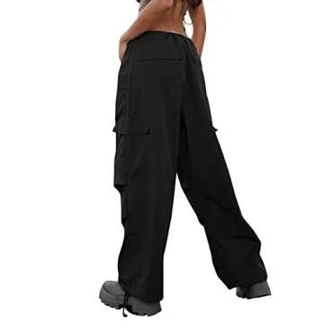 KMBANGI Low Waist Cargo Pants for Women Y2K Parachute Pants Wide Leg Loose Baggy Pants Trousers Streetwear(I-Black,S)