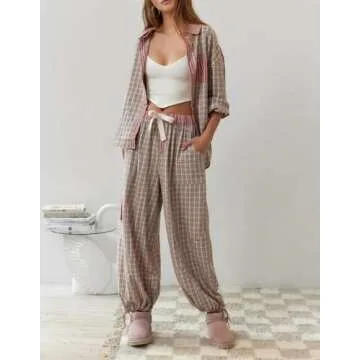 Show moreIntroducing the KMBANGI Women 2 Piece Lounge Y2k Pajamas Set, an elegant and stylish choice for those who value comfort without sacrificing flair! This exquisite sleepwear ensemble features a chic long sleeve button-down shirt paired with wide-leg harem pants, creating a relaxed yet trendy look. Crafted from a high-quality polyester blend, the fabric is lightweight, breathable, and skin-friendly, making it the perfect companion for leisurely lounging or a restful night's sleep. The nostalgic Y2k aesthetic is represented beautifully through the plaid and striped prints, ensuring you not only feel comfortable but look effortlessly cute too!