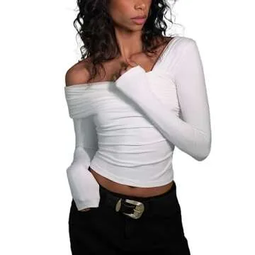 KMBANGI Women Off Shoulder Top Y2K Asymmetrical Neck Long Sleeve Shirt Tee Basic Cute Slim Fitted Crop Top Blouse(A-White One Shoulder Shirt,XS)