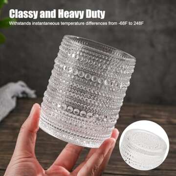 Show moreIntroducing the exquisite KMIGRUAN Hobnail Drinking Glasses Set - a stunning collection that combines functionality and elegance in each sip. This 6-piece set, meticulously crafted from food-grade, lead-free glass, is designed not just for aesthetic pleasure but also for ensuring your drinking experience is safe and enjoyable. Each glass holds 360ml (12oz) of your favorite beverages, making them perfect for everything from refreshing water, vibrant juices to delightful cocktails. Their dishwasher-safe feature means you can enjoy them hassle-free; simply toss them in the dishwasher, and they emerge sparkling without losing their distinctive shine or intricate hobnail pattern. Elevate your dining experience with these beautiful glasses that exude charm and sophistication.