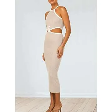 KMOLY Women's Cut Out Waist Bodycon Midi Dress Sexy Backless Sleeveless Spaghetti Strap Party Tank Dresses Apricot