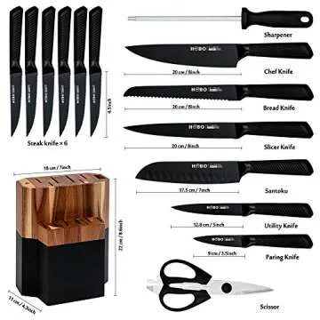 Show more Unleash your culinary creativity with the ultimate 15 Pieces Kitchen Knife Set. Crafted with high carbon stainless steel blades, these knives are designed for both professional chefs and home cooks looking for reliable performance. This set features everything you need for your kitchen: an 8” Chef Knife, an 8” Slicing Knife, a 7” Santoku Knife, an 8” Bread Knife, a 5” Utility Knife, a 3.5” Paring Knife, and more! Each knife is equipped with an ergonomic design and a sleek black anti-rust coating that not only looks elegant but enhances functionality.