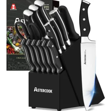 Show more The Astercook 15 Pieces Kitchen Knife Set is an essential collection designed for both novice and professional chefs alike. Each knife in this premium set is crafted from high carbon stainless steel, promising extraordinary sharpness and durability. Featuring an array of blade types, including an 8" chef knife, an 8" slicing knife, a 7" santoku knife, and a serrated bread knife, this set caters to every culinary need with finesse. Additionally, the ergonomically designed handles offer a comfortable grip, ensuring safety and efficiency while minimizing the risk of slips, even when dealing with the sharpest of blades. Completing the set is a sleek black hardwood knife block, perfect for storing your knives securely and stylishly, along with a knife sharpener that helps maintain their edge for long-lasting performance.