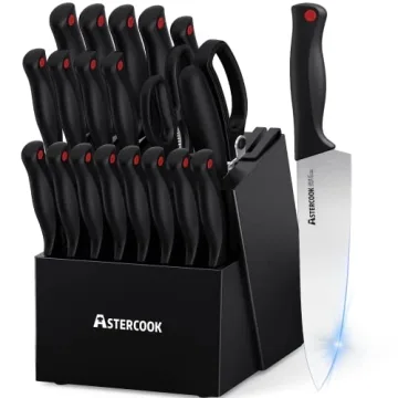 Show more Introducing the Astercook 21-Piece Knife Set – the ultimate solution for all your culinary needs! This knife set comes complete with everything you need to master your kitchen tasks, including an 8" chef knife, 8" slicing knife, 7" santoku knife, 8" serrated bread knife, and a variety of utility and specialty knives designed for precise cuts. Every knife is crafted from high-carbon German stainless steel, ensuring exceptional durability, sharpness, and resistance to rust. The set features a stylish hardwood knife block that not only keeps your knives organized but also showcases its elegant design. What sets this knife set apart is its built-in sharpener, allowing you to effortlessly hone your blades with just one hand, making maintenance a breeze when you need it most.