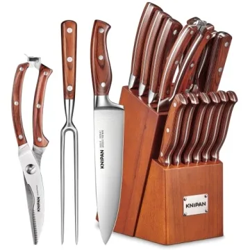 Show more Introducing the **Knipan Kitchen Knife Set with Block**, a stunning 16-piece collection crafted for both culinary enthusiasts and professional chefs alike. This comprehensive set includes all the essential knives you need in the kitchen, ranging from an 8" chef knife for versatile meal preparation to a 5" utility knife for those everyday tasks. Each knife features premium X50Cr15 German high-carbon stainless steel for exceptional durability and sharpness, ensuring your cutting tasks are executed with precision and ease. The exclusive taper grind edge technology enhances the cutting performance, meticulously hand-polished to a 16-degree edge per side for a razor-sharp finish. Experience the perfect blend of functionality and elegance with the smooth, ergonomic wooden handles that provide a comfortable grip while adding a touch of sophistication to your kitchen decor.