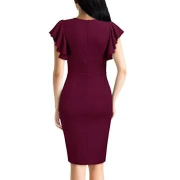 Knitee Women's Deep-V Neck Ruffle Sleeves Cocktail Party Pencil Slit Formal Dress
