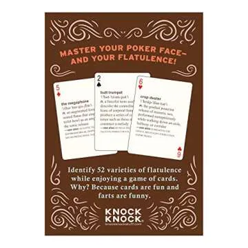 Show moreIf you’re ready to up your card game with a mix of humor and fun, look no further than the Knock Knock 52 Farts Playing Cards Deck. This hilarious, adult-themed playing card deck features a total of 52 uniquely designed cards, each defining one of 50 types of farts! Perfect for laughter-filled evenings with friends, this deck not only serves the traditional purpose of playing cards but also doubles as a conversation starter. Each card measures 2.5 x 3.5 inches, making them the perfect size to shuffle and deal while you chuckle at the creative humor. This is the ultimate gag gift for those who love to embrace their silly side!