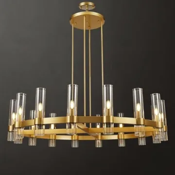 Show more Elevate your interior decor with the stunning Knurldon Modern 48" Gold Round Chandelier. This dazzling farmhouse-style wagon wheel chandelier brings a harmonious blend of elegance and modern design to any space. Crafted from high-grade gold-plated stainless steel, its 16 exquisite Edison bulbs, elegantly encased in slender glass tubes, create a warm, inviting glow reminiscent of flickering candlelight. Measuring a generous 48 inches in diameter, this chandelier serves as a perfect centerpiece for living rooms, dining areas, or businesses, infusing your space with sophistication and warmth.