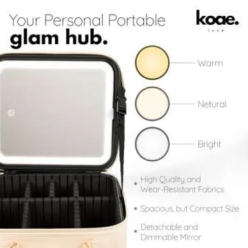 Show more Elevate your beauty routine with the Koae Luxe Makeup Bag with LED Mirror, a true portable styling sanctuary designed for the modern beauty enthusiast. This exquisite makeup bag combines functionality with luxury, featuring a spacious interior that ensures all your cosmetics and essentials are neatly organized. The LED lighted mirror makes touch-ups effortless, allowing you to illuminate your beauty regimen with three adjustable color settings: natural, warm, and cool. Say goodbye to dim lighting and hello to flawless makeup application anytime, anywhere!