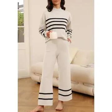 Koandaily Womens 2 Piece Striped Sweater Outfits Long Sleeve Mock Neck Pullover Top Wide Leg Pants Cozy Casual Lounge Sets