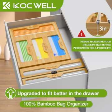 KOCWELL Bamboo Bag Storage Organizer - 2 Wrap Dispenser with Cutter & 4 Slots Food Storage Bags Container - Kitchen Drawer Plastic Bags Storage Organization for Gallon Quart Sandwich Snack Bags