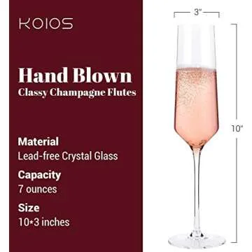 Elevate your celebrations with the stunning KOIOS Classy Champagne Flutes. Crafted from 100% lead-free premium crystal, these hand-blown glasses not only exude elegance but also enhance the taste and aroma of your favorite bubbly. At 10 inches tall and with a 7-ounce capacity, they are perfectly designed to hold just the right amount of champagne for the ideal toast. Each flute's clear, colorless design adds a sophisticated touch to any occasion, making every sip feel luxurious.