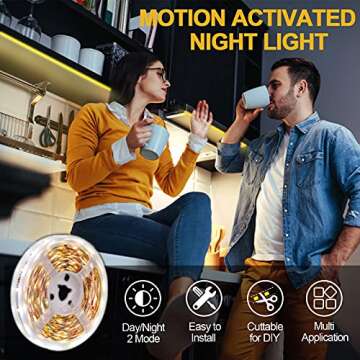 Show more KOLANDY's Motion Activated LED Light Strip transforms your home into a beautifully illuminated sanctuary, combining innovative design with practical functionality. This remarkable light strip features two sensor modesāDay Mode, which keeps the light on as long as motion is detected, and Night Mode, ensuring it illuminates only in low-light conditions. With 45 SMD2835 LEDs, this light strip provides soft yet powerful lighting that covers a wide area, making it ideal for various indoor spaces.