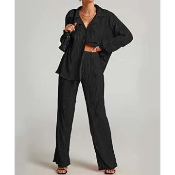 The outfit features a long sleeve button-down shirt with a turn-down collar, an open front, and a deep V-neck design, providing a stylish yet comfortable fit. The matching wide-leg pants come with a high-waist and an elastic waistband, effortlessly adapting to your body while offering that chic, laid-back style. Available in classic solid colors, this outfit is easy to accessorize and can be dressed up or down depending on the occasion.