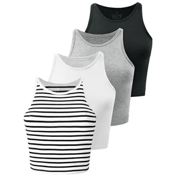 Kole Meego High Neck Crop Tops 4-Pack - Women's Workout Yoga Athletic Tanks (Black/White/Grey/Striped, S)