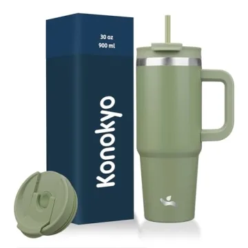 Introducing the versatile Konokyo Insulated Tumbler with Handle, expertly crafted from premium 18/8 stainless steel. This tumbler features double-wall vacuum insulation that keeps your beverages cold for up to 8 hours and hot for up to 6 hours, making it the perfect companion for your busy lifestyle. Its large capacity ensures you stay hydrated throughout the day, requiring fewer refills and maximizing your enjoyment. The non-sweat exterior prevents condensation, keeping your hands dry, and the thoughtfully...