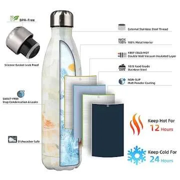 Show more If you're looking for a reliable and stylish hydration companion, look no further than our exceptional Food Grade 18/8 Stainless Steel Water Bottles. Engineered from BPA-free and non-toxic materials, these bottles are designed to keep you safe and healthy while quenching your thirst. Their sleek double wall vacuum insulation ensures that your beverages stay ice cold for up to 24 hours and hot for up to 12 hours, making them perfect for any situation. The meticulously crafted leak-proof and dust-proof design keeps your drinks securely contained, letting you carry your favorite beverages with peace of mind.