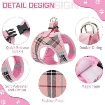 KOOLTAIL Small Dog Harness and Lead Set, Soft Mesh Plaid Puppy Harness with Safety Buckle, Adjustable & Comfortable Padded Reflective Vest for Puppies and Small Breeds Dogs Walking,Pink,X-Small