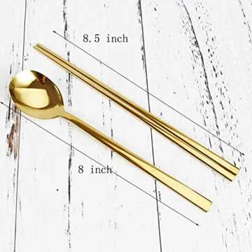 Korean Chopsticks and Spoon Set with Long Flat Hand, Metal Durable Stainless Steel Flatware, Dishwasher Safe, 3 Set. (Gold)