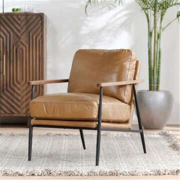 Show moreExperience the fusion of style and comfort with the Kosas Home Arnold Cushion Back Transitional Leather Club Chair. This exceptional chair features a stunning combination of top grain leather upholstery that exudes quality and sophistication, paired elegantly with a sturdy iron frame. Designed in a classic tan and black color scheme, this chair effortlessly complements various interior decors, making it a perfect addition to any living space. The rubberwood armrests provide a warm touch, enhancing the overall aesthetic while ensuring durability. With its angled backrest and sled arm design, this chair not only offers an inviting seat but also adds a modern flair to your home.