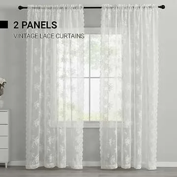 Kotile Ivory Lace Curtains 84 Inches Long - Vintage Embroidered Floral Sheer Lace Curtains for Living Room, Scalloped Privacy Lace Curtain Panels for Windows, 52 x 84 Inch, 2 Panels, Ivory