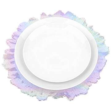 Show moreElevate your dining experience with the Koyal Wholesale Bulk Flora Glass Charger Plates. This exquisite set of four iridescent starburst charger plates is designed to add a touch of glamour to any occasion. Measuring 13 inches in diameter, they are perfect for enhancing the presentation of standard 9-inch and 10-inch dinnerware, making them an essential addition for upscale parties, wedding receptions, and special events. Crafted with meticulous attention to detail, these plates exhibit a stunning iridescent finish that reflects light beautifully, creating a visually striking table setting.