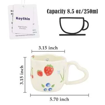 Show moreDiscover the magic of your morning brews with the Koythin Ceramic Coffee Mug, an exquisite piece that enhances every coffee experience with rustic charm and modern elegance. With its innovative heart-shaped handle and unique designs featuring vibrant strawberries and blue flowers, this mug is not just a drinkware accessory; it’s a statement piece that brings joy and warmth to your daily ritual. Measuring 8.5 ounces, it's perfectly sized for your lattes, teas, or any favorite hot beverage, all while delighting you with its thoughtful craftsmanship.