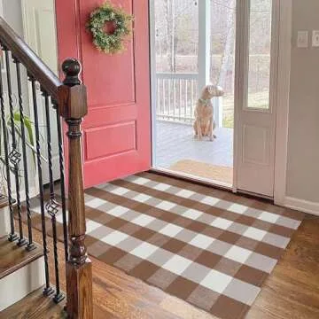 Show more Welcome to your new favorite home accessory! The **KOZYFLY Buffalo Plaid Area Rug** is a stunning 3' x 5' piece that combines functionality with style. Made from a soft yet durable cotton-polyester blend, this rug is designed to be your go-to mat for any space, especially entryways and porches. The rich coffee and white checkered pattern brings a cozy, warm ambiance to your home, making it perfect for welcoming guests while protecting your floors. Its machine washable feature offers an easy-care solution, ensuring your rug always looks fresh and clean. With a pile height of just 0.14 inches, it's not only easy to vacuum, but it also fits seamlessly under doors without hassle. Thanks to its versatile design, this rug complements outdoor spaces just as elegantly as it does indoors.