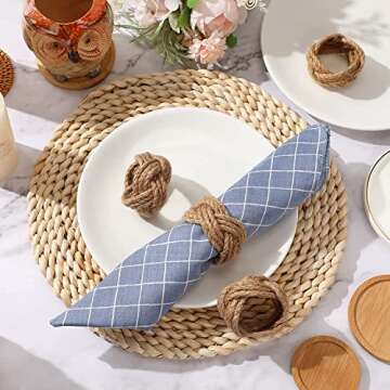 Show moreElevate your dining experience with the KPAVIR Handmade Round Mesh Classic Braided Jute Napkin Rings. Crafted from 100% jute, these napkin rings are a perfect blend of style and functionality. Their minimalist modern design ensures they complement any table setting, making them an ideal addition for both casual meals and formal gatherings. Each set contains four exquisitely handcrafted napkin rings, showcasing the artistry of skilled artisans who meticulously create each piece. Durable yet elegantly simple, they are designed to enhance your dining occasions, whether it's a cozy family dinner or an extravagant party.