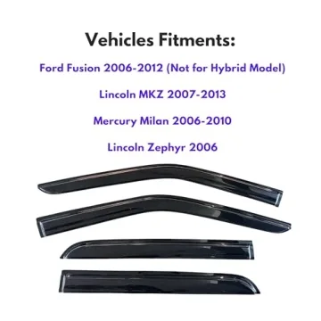 Show moreIntroducing the KPY Rain Guard Vent Deflectors, a must-have accessory for your Ford Fusion, Lincoln MKZ, Mercury Milan, or Lincoln Zephyr! Designed with precision, these window visors provide the ultimate solution for keeping the elements at bay while allowing fresh air into your vehicle. Crafted specifically for the models from 2006 to 2012, you can expect a perfect fit that enhances the sleek aesthetic of your car. Made from high-quality materials, they boast impressive durability and resilience against UV rays and scratches, ensuring they maintain their sleek appearance over time.