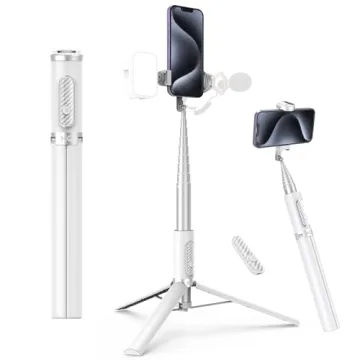 Show more KraftGeek 60" Phone Tripod for iPhone is your premier companion for capturing stunning photos and videos wherever you go. This innovative product seamlessly combines the functionality of a selfie stick and a tripod, making it the perfect solution for vloggers, travelers, and photography enthusiasts. With its adjustable aluminum alloy rod, you can easily transform it from a handheld selfie stick to a stable tripod with just a push of a button. The thoughtful design includes anti-slip silicone padding at the base, ensuring enhanced stability during use, thus allowing you to capture the perfect moment without any shaky footage. Whether you're shooting a scenic view or a group shot, the KraftGeek tripod has you covered.