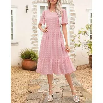 Show moreIntroducing the exquisite Kranda 2025 Women Spring Round Neck Smocked Beach Wedding Guest Dress, your new go-to addition for effortless style this season! Crafted with utmost attention to detail, this beautiful Pink Midi Dress combines elegance and comfort, making it perfect for any occasion. The delicate smocking at the bust and waist embraces your figure beautifully, while the feminine short flutter sleeves and round neckline add a touch of charm. Designed with a single button closure and a keyhole detail at the back, this dress ensures an easy fit and a sophisticated look. The solid colors enhance its versatility, and the lining prevents any transparency, ensuring you can wear it with confidence. Furthermore, the ruffled tiered detail near the hem gives this dress an ideal flutter for all-day movement, allowing you to feel both stylish and comfortable!