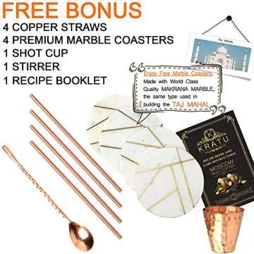 Show moreElevate your drinkware collection with the KRATU Moscow Mule Copper Mugs, an exquisite set that perfectly embodies elegance and functionality. Each mug is crafted from 100% pure, food-safe copper, ensuring a luxurious drinking experience as you enjoy your refreshing Moscow Mules. Boasting a generous 18 oz capacity, these mugs are not only perfect for the classic cocktail but also for other beverages like iced tea, lemonade, and more. This thoughtfully curated gift set includes four stunning copper mugs, four real marble coasters that add a touch of sophistication, four premium stainless steel straws, a stylish shot glass, and a classic stirrer. All beautifully packaged in a luxurious box, this set is ideal for special occasions or as a splendid everyday indulgence.