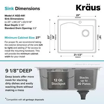 Show moreIntroducing the remarkable KRAUS Quarza 25-inch Drop-In/Undermount Single Bowl Granite Kitchen Sink, a true game-changer in kitchen design and functionality. Crafted from a sophisticated blend of durable quartz composite, this sink mirrors the stunning aesthetics of natural granite, providing a sleek, modern look while boasting superior resilience against impacts, scratches, and everyday wear and tear. With dimensions of 25” L x 22” W x 9 7/8” D for the exterior and a generous 21 1/2” L x 18” W x 9 1/8” D bowl, this sink is the perfect choice for compact kitchens or utility areas where both beauty and practicality ensure a seamless experience.
