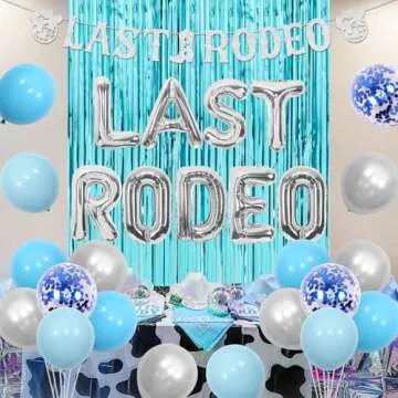 Show moreTransform your bachelorette celebration into a memorable western-themed extravaganza with the kreat4joy Last Rodeo Bachelorette Decorations. This striking set features a delightful combination of blue silver balloons, a shimmering fringe curtain backdrop, and a charming last rodeo banner. Designed for the modern cowgirl, this collection effortlessly blends a rustic theme with a hint of disco glamour, perfect for making your last night out as a single gal truly unforgettable.