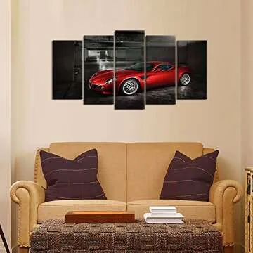 Show more Transform your space with the stunning KREATIVE ARTS 5 Panels Red Sport Car Wall Art. Featuring a breathtaking depiction of a sleek red sport car against a dramatic black and white backdrop, this canvas painting is the perfect addition to any modern home or office. Each panel is expertly printed with high-quality inks on durable canvas, ensuring that the vibrant colors and intricate details pop, drawing attention from every angle. The bold contrast of red and black not only adds a dynamic flair but also complements a range of interior styles, making it a versatile choice for decoration.