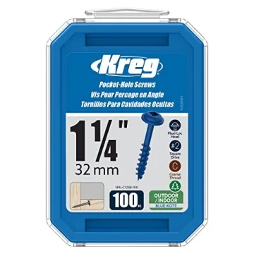 Show more Transform your woodworking projects with the exceptional Kreg SML-C125B-100 Blue-Kote Weather Resistant Pocket Screws. Measuring at a convenient 1 1/4 inches, these screws are designed with a unique Maxi-Loc head that provides unparalleled grip, preventing any slipping during the driving process. Perfect for both professionals and hobbyists, these coarse thread screws are tailored for softwoods and plywood, ensuring an optimal connection for all your projects. Their innovative self-tapping design removes the hassle of pre-drilling pilot holes, saving you time and enhancing your productivity.