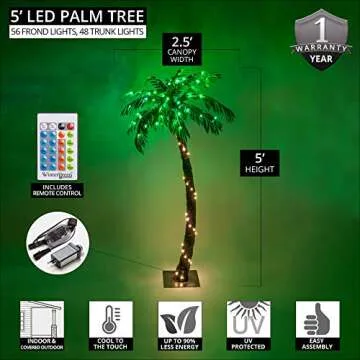 Show more Transform your living space into a tropical oasis with the stunning Kringle Traditions 5-Ft 10-Function LED Lighted Palm Tree. This beautifully crafted artificial palm tree boasts 104 vibrant LED lights, including 48 warm white fairy lights intricately wrapped around the trunk and 56 green mini lights that are delicately interspersed throughout the lush canopy. At 5 feet tall, it offers a striking presence that can seamlessly fit into any home décor, whether indoors or in a covered outdoor area.
