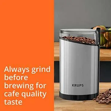 Show more If you are a coffee enthusiast or a culinary creator, the Krups Electric Coffee and Spice Grinder is your ultimate companion in the kitchen. Known for its powerful 200-watt motor and durable stainless steel blades, this grinder ensures precise and consistent grinding, capable of making up to 12 cups of coffee in one go. But it doesn't stop at coffee; this versatile appliance is equally adept at grinding spices, nuts, and grains, making it a vital tool for anyone looking to enhance their culinary creations.
