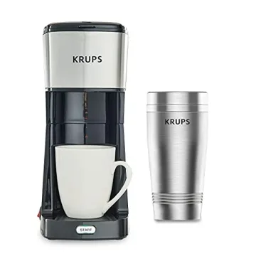 Show more Introducing the Krups Simply Brew Stainless Steel Single Serve Drip Coffee Maker—your ultimate companion for fresh, hot coffee anytime, anywhere! Designed with the convenience of coffee lovers in mind, this sleek drip coffee maker brews an impressive 12 fl oz cup of coffee at the push of a button. Its stylish double-walled stainless-steel travel tumbler not only keeps your brew piping hot but also ensures that you won't burn your hands on those brisk mornings. With a focus on quality and simplicity, brewing like a professional barista in your kitchen has never been easier.