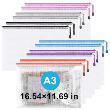 Show moreIf you're on the hunt for a reliable and versatile storage solution, the Krvyrn Zipper Pouch is your ultimate answer! This set of 12 A3 Size (16.9x12.4 inches) zipper bags is not just about functionality but also excellence in design. Crafted from thickened PVC, these pouches are both waterproof and moisture-resistant (excluding the zipper), keeping your important items safe from unexpected spills and humidity. Whether in a busy office, chaotic school environment, or your cozy home, these Mesh Zip File Folders are tailored to meet every storage need with elegance.