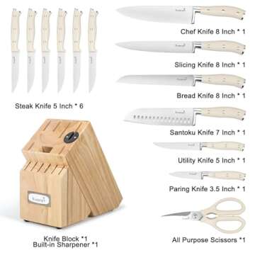 The set includes everything you need for versatile meal preparation: a professional 8” chef knife, a versatile 8” slicing knife, a 7” santoku knife for intricate cuts, an 8” serrated bread knife, a handy 5” utility knife, and a 3.5” paring knife for delicate tasks. To complete your kitchen arsenal, it also comes with 6 steak knives, a pair of kitchen shears, and a beautifully designed wooden block equipped with a built-in sharpener, ensuring you always have your tools ready to tackle any recipe.