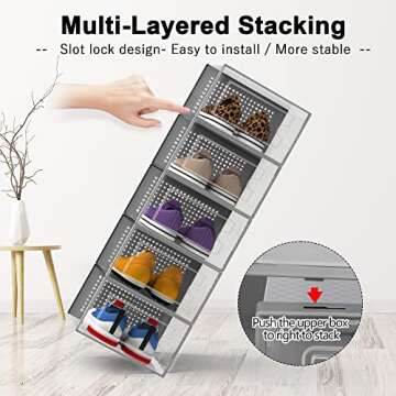 Kuject Shoe Organizers Storage Boxes for Closet, 12 Pack Clear Plastic Stackable Storage Bins with Lids, Under Bed Shoe Containers for Entryway, Drop Front, Fit up to Women's Size 10,Grey