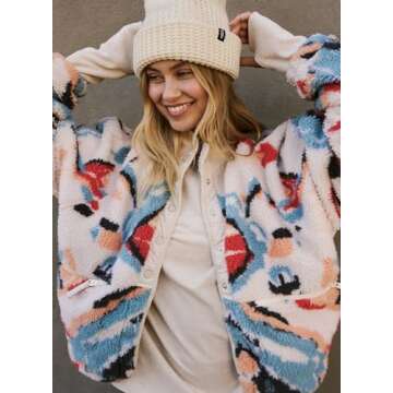 Show more Stay cozy and stylish with the Kumufenc Printed Sherpa Jacket. This long-sleeve, button-down fleece coat is crafted from premium, soft fabrics that are designed to keep you warm without compromising on style. Its easy, slouchy silhouette falls perfectly at the waist, making it an ideal layering piece for chilly days or relaxed outings. With its fashionable printed design and practical features like nylon patches and elastic cuffs, this jacket is more than just outerwear—it's a statement piece that effortlessly blends comfort and trendiness.